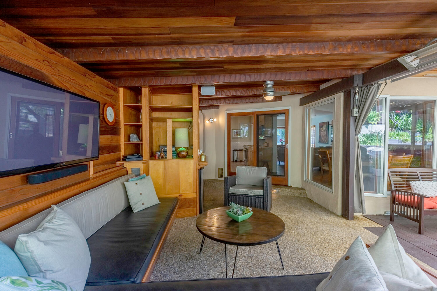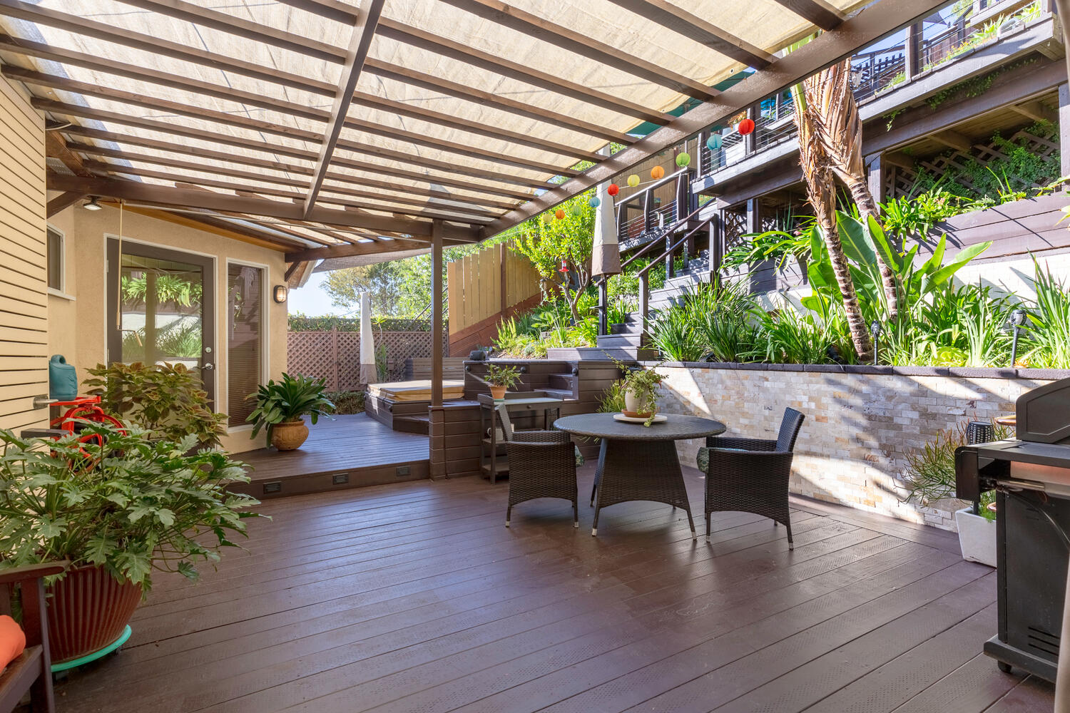 Your lush gardens include orange and lemon trees, 5 mature palms, silver dollar eucalyptus tree, variegated raspberry bougainvillea, and purple agapanthus which add vibrant color to the garden May-July. Inside, you will find an open floor plan which boasts vinyl floors throughout, updated bathrooms with travertine and pebble floors, two spacious bedrooms, and a sun deck off the front of the home for your morning coffee.